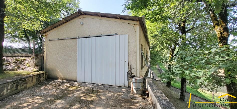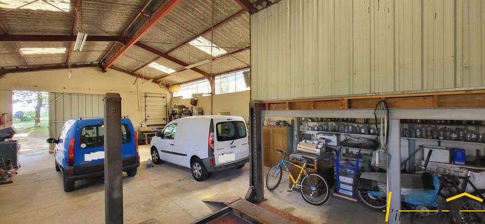 Ensemble immobilier composé d’une maison de plain-pied, deux ateliers et 1,4 hectares de terrain autour.